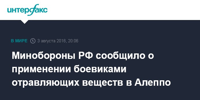 Хмеймим (Латакия, Сирия). 3 августа. INTERFAX.RU - Семь человек погибли, более 20 госпитализированы в результате применения боевиками в Алеппо отравляющих веществ, сообщил в среду журналистам начальник российского Центра по применению враждующих сторон в Сирии генерал-лейтенант Сергей Чварков.