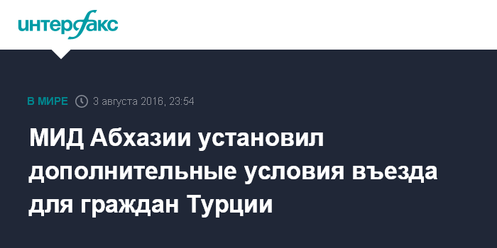 Москва. 3 августа. INTERFAX.RU - Дополнительные условия для въезда граждан Турции введены в Абхазии. Как сообщает пресс-служба МИД республики, в перечень документов, необходимых для въезда граждан Турции в Абхазию введена справка "о наличии (отсутствии) судимости и (или) факта уголовного преследования, либо о прекращении уголовного преследования".