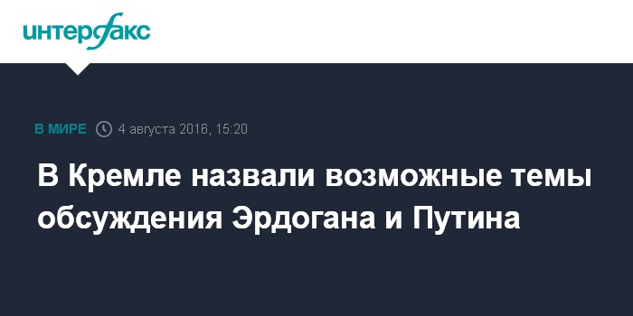 Москва. 4 августа. INTERFAX.RU - Президент РФ Владимир Путин и президент Турции Реджеп Тайип Эрдоган, как ожидается, обсудят темпы реставрации двусторонних отношений, а также ситуацию вокруг Сирии, сообщил пресс-секретарь президента РФ Дмитрий Песков.