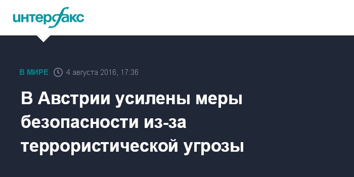 Москва. 4 августа. INTERFAX.RU - Австрийские власти приняли решение усилить меры безопасности после получения на почту сообщений о готовящихся нападениях на полицейские участки, сообщает в четверг французская радиостанция "Эроп-1" со ссылкой на МВД Австрии.