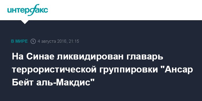 Москва. 4 августа. INTERFAX.RU - Египетская армия ликвидировала на Синайском полуострове лидера террористической группировки "Ансар Бейт аль-Макдис", говорится в заявлении военного командования страны.