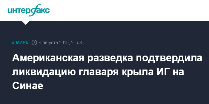 Москва. 4 августа. INTERFAX.RU - Главарь группировки "Ансар Бейт аль-Макдис" Абу Дуаа аль-Ансари действительно уничтожен, подтвердили в четверг американскому телеканалу Fox News источники в разведслужбах США.