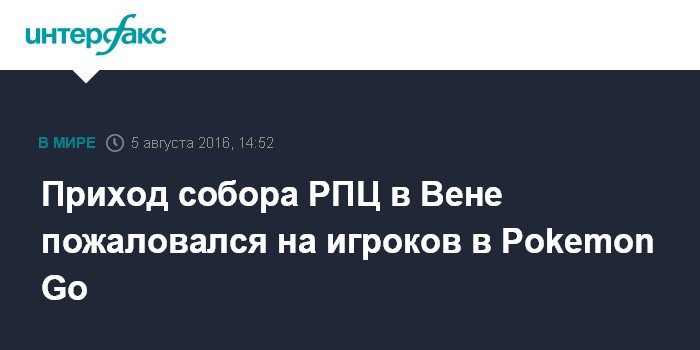 Москва. 5 августа. INTERFAX.RU - Участники игры Pokemon Go проникли в русский собор в Вене, после чего приход Никольского собора Московского патриархата в Вене подал официальную жалобу на приверженцев игры.