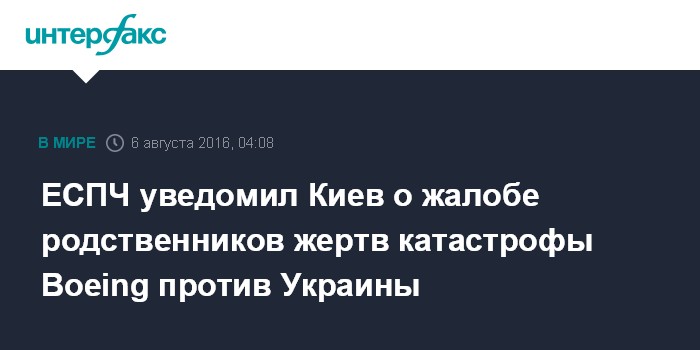 Москва. 6 августа. INTERFAX.RU - Европейский суд по правам человека (ЕСПЧ) коммуницировал жалобу против Украины по делу о крушении малайзийского Boeing 777 на востоке Украины 17 июля 2014 года, сообщает в субботу "Коммерсант". Коммуницирование жалобы ЕСПЧ означает направление запроса ответчику.