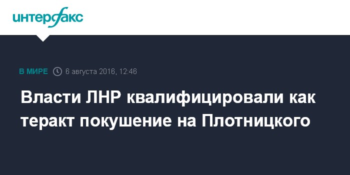 Москва. 6 августа. INTERFAX.RU - В руководстве самопровозглашенной Луганской народной республики расценивают как теракт взрыв автомобиля, в котором находился глава ЛНР Игорь Плотницкий.