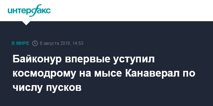 Как сказал собеседник агентства, "за месяцы, оставшиеся до конца года, Байконуру не удастся вернуть первенство: с него может быть выполнено от пяти до шести пусков, в то время как с мыса Канаверал на этот же период намечено около полутора десятка пусков".