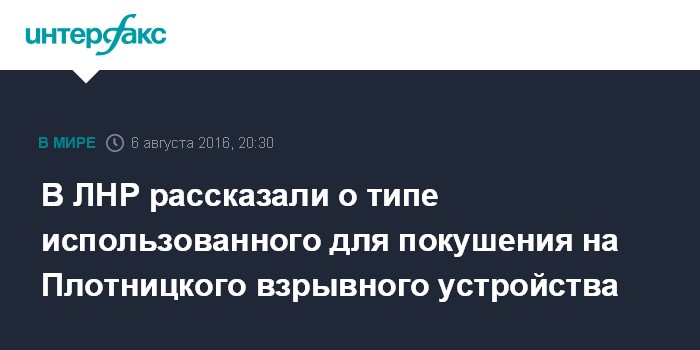 Москва. 6 августа. INTERFAX.RU - Мощность взрыва, в результате которого пострадал глава самопровозглашенной Луганской народной республики Игорь Плотницкий, составляла 10-15 кг в тротиловом эквиваленте, сообщает "Луганский информационный центр" (ЛИЦ) со ссылкой на пресс-службу Министерства госбезопасности ЛНР.
