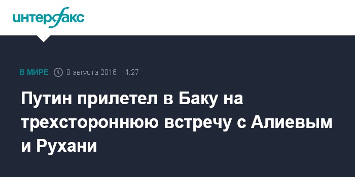 Москва. 8 августа. INTERFAX.RU - Президент РФ Владимир Путин в понедельник прибыл в Баку, где впервые состоится трехсторонняя встреча лидеров России, Азербайджана и Ирана.