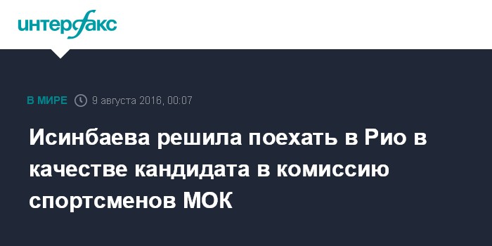 Москва. 9 августа. INTERFAX.RU - Двукратная олимпийская чемпионка в прыжках с шестом Елена Исинбаева 14 августа отправится на Олимпийские игры в Рио-де-Жанейро в качестве кандидата в комиссию спортсменов Международного олимпийского комитета (МОК).