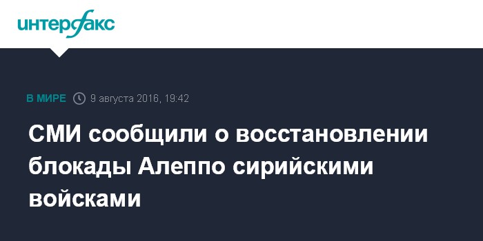 Москва. 9 августа. INTERFAX.RU - Бойцы сирийских правительственных войск сумели во вторник восстановить блокаду города Алеппо, сообщают ливанские телеканалы "Аль-Манар" и "Аль-Маядин".