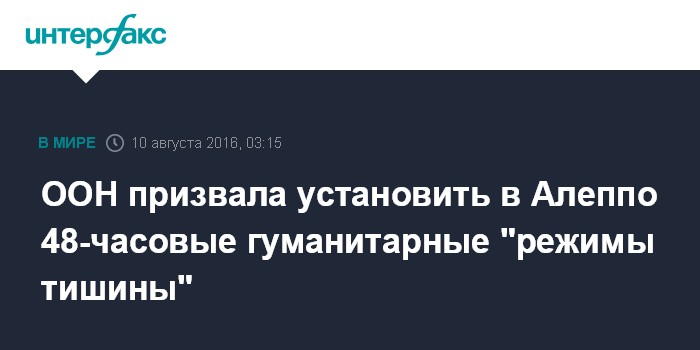 Москва. 10 августа. INTERFAX.RU - Заместитель Генерального секретаря ООН по гуманитарным вопросам Стивен О'Брайен призвал установить в сирийском Алеппо "гуманитарную паузу" на два дня в неделю.