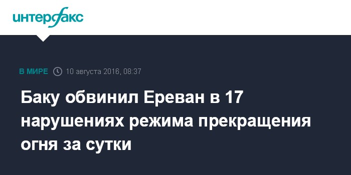 Москва. 10 августа. INTERFAX.RU - Вооруженные силы Армении нарушили за минувшие сутки режим прекращения огня на линии соприкосновения азербайджанских и армянских вооруженных сил 17 раз, сообщает пресс-служба Министерства обороны Азербайджана.