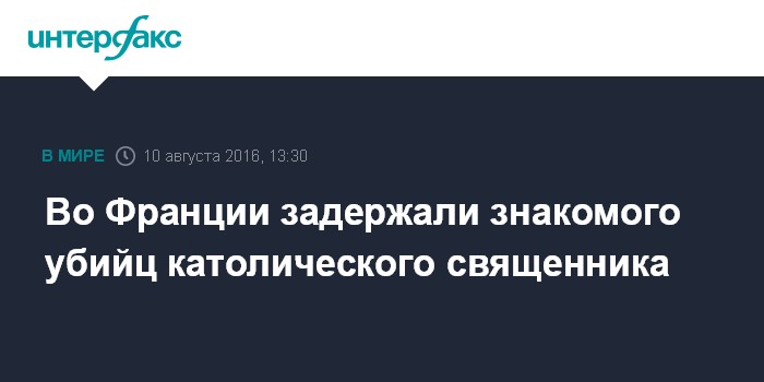 Москва. 10 августа. INTERFAX.RU - Молодой человек взят под стражу в районе французского города Тулузы в рамках расследования дела о захвате заложников и убийстве священника в Сен-Этьен-дю-Руврэ близ Руана, сообщает в среду телеканал France 3.