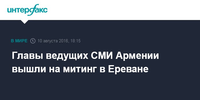 Москва. 10 августа. INTERFAX.RU - На площади Свободы в Ереване проходит митинг под девизом "Во имя свободы слова", организованный руководителями ведущих средств массовой информации Армении с целью осудить насилие и нападения на журналистов, сообщает корреспондент "Интерфакса".