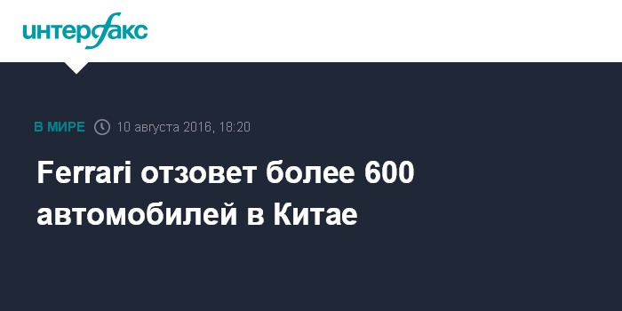 Москва. 10 августа. INTERFAX.RU - Итальянский автопроизводитель Ferrari отзовет с китайского рынка 621 машину из-за дефекта подушек безопасности, сообщает Главное государственное управление по контролю качества, инспекции и карантину КНР.