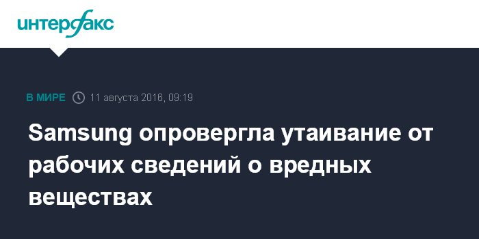 Москва. 11 августа. INTERFAX.RU - Южнокорейская компания Samsung опровергла сообщения о том, что она якобы скрывала от своих работников наличие вредных веществ на производстве.