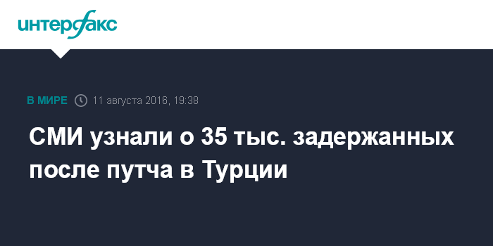 Москва. 11 августа. INTERFAX.RU - Власти Турции после попытки военного переворота задержали более 35 тыс. человек, сообщают в четверг французские СМИ со ссылкой на знакомые с ситуацией источники.
