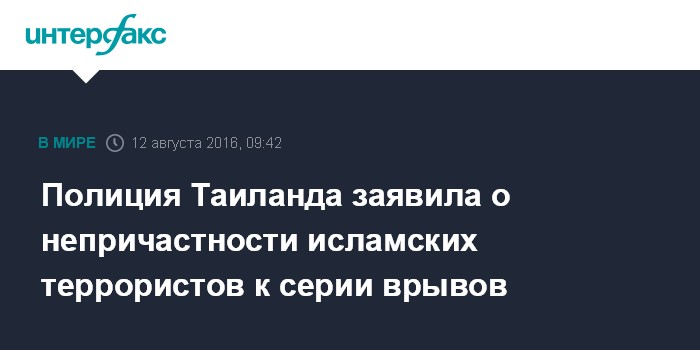 Москва. 12 августа. INTERFAX.RU - Серия взрывов в центральной и южной частях Таиланда в ночь на пятницу не имеет отношения к международному терроризму, считают в таиландской полиции.