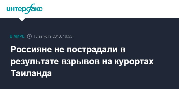 Москва. 12 августа. INTERFAX.RU - Граждан России нет среди жертв взрывов в Таиланде, сообщает в пятницу пресс-служба Ростуризма.
