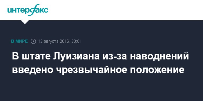 Москва. 12 августа. INTERFAX.RU - Власти американского штата Луизиана объявили в пятницу о введении чрезвычайного положения из-за сильных дождей и наводнений, сообщает агентство AP. Из-за продолжающихся ливней вышли из берегов многие реки на юго-востоке штата Луизиана и на юге штата Миссисипи.