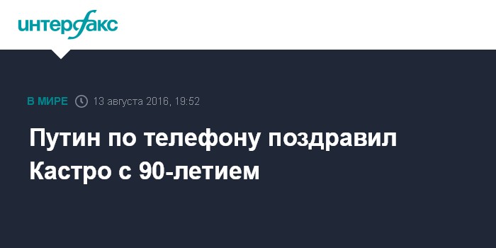 Москва. 13 августа. INTERFAX.RU - Президент Российской Федерации Владимир Путин тепло поздравил по телефону Фиделя Кастро с 90-летием, сообщила пресс-служба Кремля.