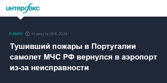 Москва. 14 августа. INTERFAX.RU - Один из двух самолетов Бе-200 МЧС России, тушивших лесные пожары в Португалии, вернулся в аэропорт базирования португальского города Лейрия из-за технической неисправности, сообщили в пресс-службе МЧС.