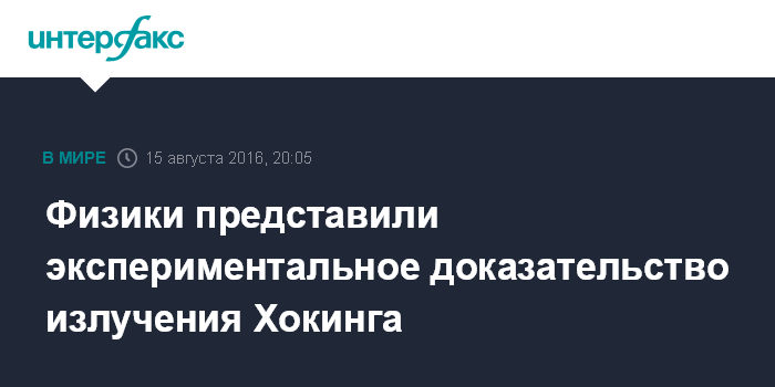 Москва. 15 августа. INTERFAX.RU - Физик из Израильского технологического института Джефф Штайнхауэр предоставил экспериментальное доказательство существования излучения Хокинга, сообщает The Business Insider.