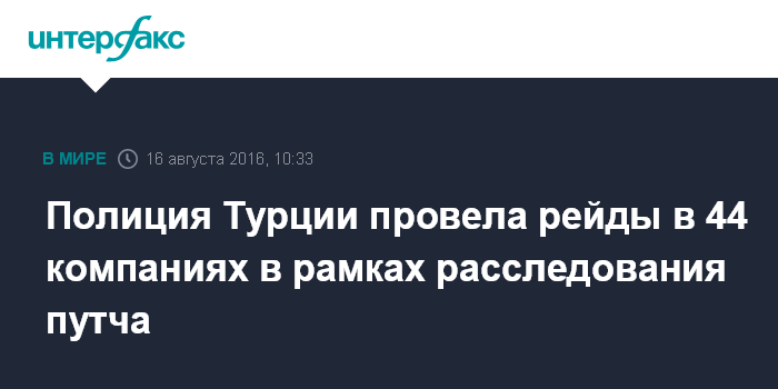 Москва. 16 августа. INTERFAX.RU - Турецкие полицейские провели рейды в 44 стамбульских компаниях во вторник в рамках расследования попытки госпереворота, сообщает во вторник газета Hurriyet.