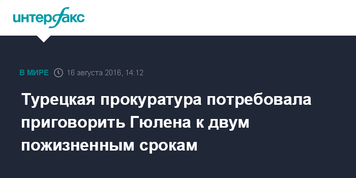 Москва. 16 августа. INTERFAX.RU - В прокуратуре Турции потребовали во вторник приговорить к двум пожизненным срокам мусульманского богослова Фетхуллаха Гюлена, обвиняемого Анкарой в организации недавней неудавшейся попытки госпереворота, сообщают официальные турецкие СМИ.