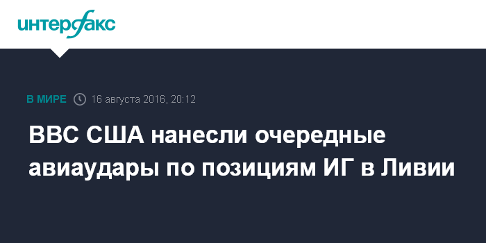 Москва. 16 августа. INTERFAX.RU - Американские ВВС нанесли очередные авиаудары по позициям террористической групировки "Исламское государство" (ИГ, запрещена в РФ) в ливийском городе Сирт. Уничтожен один автомобиль боевиков и четыре укрепления, говорится в заявлении министерства обороны США.