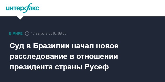 Москва. 17 августа. INTERFAX.RU - Федеральный суд Бразилии во вторник возобновлял расследование в отношении президента страны Дилмы Русеф, которая ранее была отстранена от власти, сообщили местные СМИ.