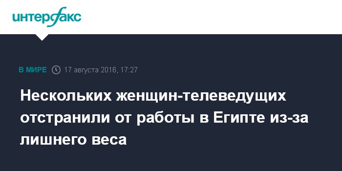 Москва. 17 августа. INTERFAX.RU - Восемь женщин-телеведущих отстранены от работы на государственном телевидении Египта из-за проблем с лишним весом, сообщает "Би-би-си".