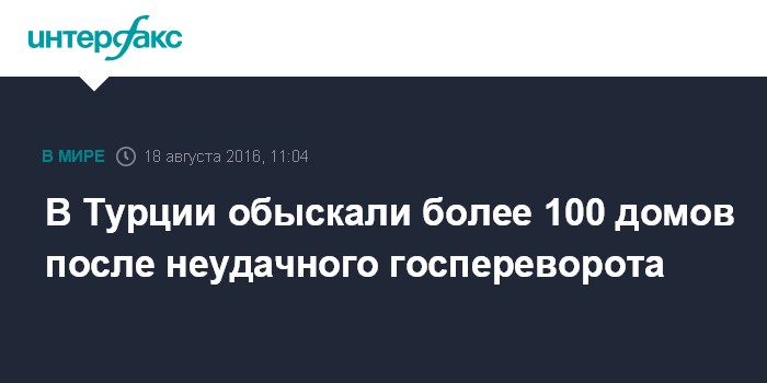 Москва. 18 августа. INTERFAX.RU - Сотрудники полиции Турции после попытки военного переворота обыскали более чем 100 домов в Стамбуле, задержав при этом еще несколько человек, сообщает в четверг информагентство "Доган".