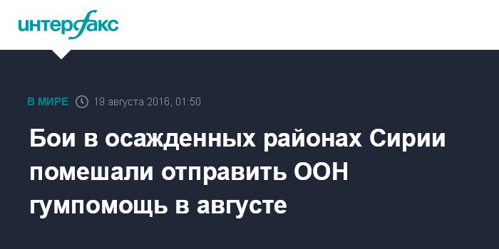 Москва. 19 августа. INTERFAX.RU - В августе ООН не смогла отправить гуманитарный груз ни в один из осажденных районов Сирии из-за вооруженных столкновений, заявил на брифинге в Женеве специальный посланник ООН по Сирии Стаффан де Мистура.