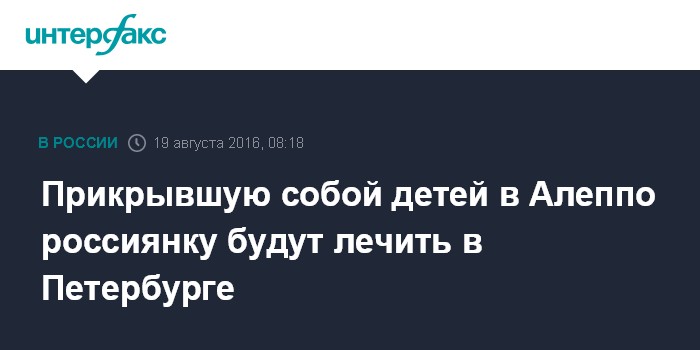 Москва. 19 августа. INTERFAX.RU - Женщина, которая потеряла руку и ногу, прикрывая своих детей от обстрела боевиков в сирийском Алеппо, самолетом военно-транспортной авиации доставлена в Петербург на лечение.