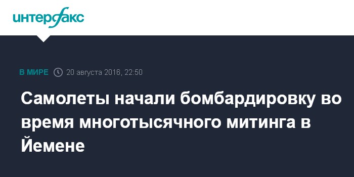 Москва. 20 августа. INTERFAX.RU - Большое число жителей Йемена приняли участие в демонстрации в столице Сане в поддержку повстанцев Хути и их союзников, во время манифестации над площадью пролетели самолеты, которые сбросили несколько бомб, передает BBC.