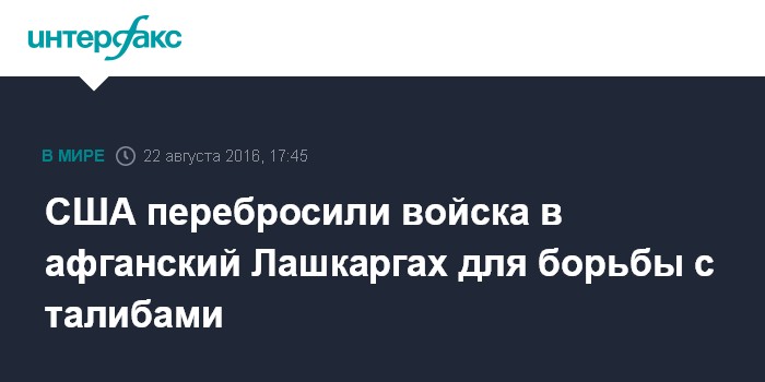 Москва. 22 августа. INTERFAX.RU - Командование контингентом США в Афганистане перебросило около 100 военнослужащих в город Лашкаргах (столица провинции Гильменд) для помощи в борьбе с талибами, сообщает в понедельник агентство Associated Press.