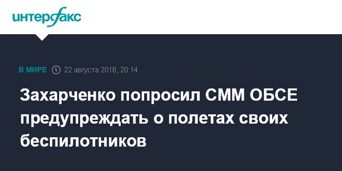 Он также выступил с предложением, чтобы ОБСЕ предупреждала представителей ДНР о работе своих беспилотников. "В этом случае их работе никто не будет препятствовать. В противном случае наши военнослужащие воспринимают беспилотники как неопознанные летательные аппараты, которые могут нести угрозу нашим жителям. Как известно, в последнее время украинская сторона использует свои беспилотники не только для разведки и последующих артиллерийских обстрелов, но и непосредственно для атаки, начиняя беспилотники взрывчаткой", - сказал Захарченко "Интерфаксу".