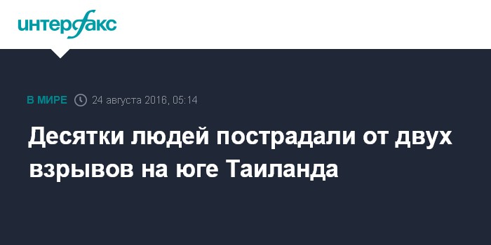 Москва. 24 августа. INTERFAX.RU - Один человек погиб, более 30 получили ранения, в том числе тяжелые, в результате двух взрывов в таиландской курортной провинции Паттани, сообщили СМИ со ссылками на заявления представителей местной полиции.