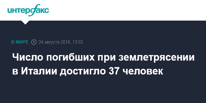 Москва. 24 августа. INTERFAX.RU - Число погибших при землетрясении в Италии, к настоящему моменту достигло 37 человек, сообщает "Би-би-си". По последним данным, около 150 человек числятся пропавшими без вести. Многие из найденных погибших проживали в деревне Пескара дель Тронто, которую стихийное бедствие сравняло с землей.