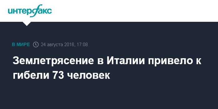 Москва. 24 августа. INTERFAX.RU - Землетрясение, произошедшее в Италии, по последним данным, унесло жизни 73 человек, сообщает в среду местное телевидение со ссылкой на данные службы гражданской обороны.