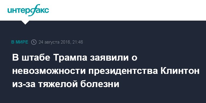 "Это серьезное дело. Эта женщина очень больна, и они пытаются это скрыть. Поэтому речь не о том, что Хиллари Клинтон может быть президентом последующие восемь лет, а что восемь лет президентом по сути будет Тим Кейн (кандидат в вице-президенты США от демократов - ИФ). Вот что происходит", - добавил он.