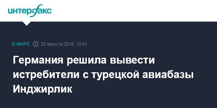 Москва. 25 августа. INTERFAX.RU - Вооруженные силы ФРГ готовятся к перемещению шести истребителей Торнадо с турецкой авиабазы Инджирлик, после того, как Анкара запретила депутатам Бундестага посетить ее, сообщил в четверг журнал Der Spiegel.