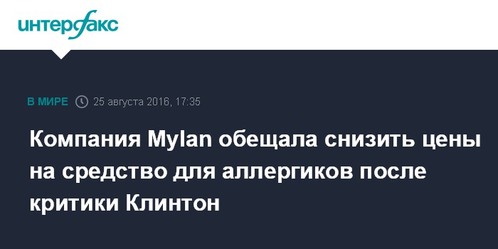 Москва. 25 августа. INTERFAX.RU - Американская фармацевтическая компания Mylan NV пообещала немедленно снизить цены на шприцы-тюбики для аллергиков EpiPen, используемые в качестве экстренной помощи при анафилактическом шоке. Причиной стало давление на компанию со стороны целого ряда политических деятелей, включая кандидата в президенты США Хиллари Клинтон.