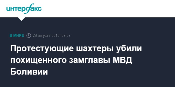 Москва. 26 августа. INTERFAX.RU - Заместитель главы МВД Боливии Родольфо Ильянес похищен и убит протестующими шахтерами, сообщает в пятницу BBC News со ссылкой на правительство страны.