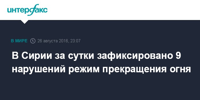 Москва. 26 августа. INTERFAX.RU - Девять нарушений режима прекращения огня зафиксировано за сутки в Сирии, сообщает Минобороны РФ.
