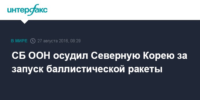 Москва. 27 августа. INTERFAX.RU - Совет безопасности ООН в пятницу осудил Северную Корею за очередной запуск баллистической ракеты.