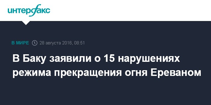 Москва. 28 августа. INTERFAX.RU - Вооруженные силы Армении нарушили за минувшие сутки режим прекращения огня на линии соприкосновения азербайджанских и армянских вооруженных сил 15 раз, сообщает пресс-служба министерства обороны Азербайджана.