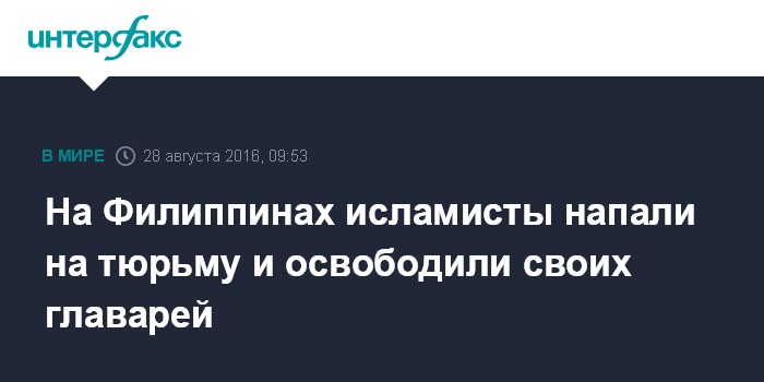 Москва. 28 августа. INTERFAX.RU - Группа исламских экстремистов атаковала тюрьму в филиппинском городе Малави и освободили 28 заключенных, сообщила местная полиция в воскресенье.