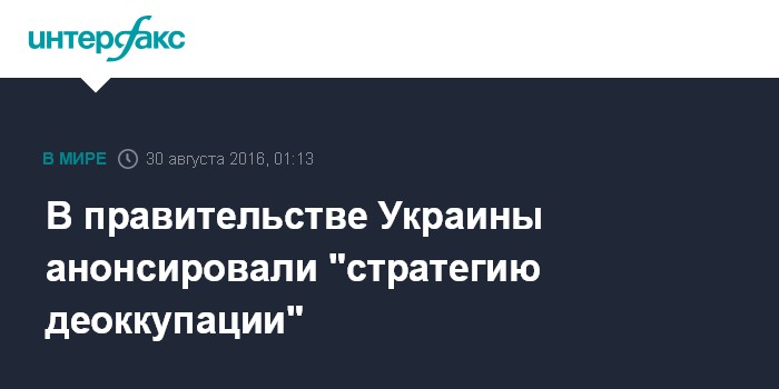 Москва. 30 августа. INTERFAX.RU - Стратегия деоккупации украинских территорий будет представлена в среду на заседании правительства Украины, заявил заместитель министра Украины по вопросам временно оккупированных территорий и временно перемещенных лиц Георгий Тука.